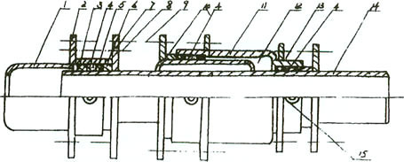 1.后套管體 2.固定法蘭 3.定型石墨填料 4.注油池 5.填料室 6.填料壓緊圈 7.壓蓋法蘭 8.壓蓋螺絲 9.連接螺絲10.汽室填料室 11.汽室體 12.汽室 13.汽室小填料室 14.伸縮管 15.注油孔