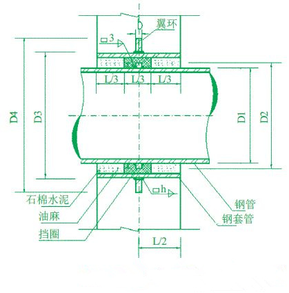 防水套管結(jié)構(gòu)簡圖見圖1 。管徑理解錯誤為概 念錯誤,其錯誤之處在于未正確理解標(biāo)準(zhǔn)圖集中D1和D3的關(guān)系,即未正確理解套管與穿過套管的管道的關(guān)系。在結(jié)構(gòu)施工圖中,設(shè)計者一般標(biāo)示預(yù)埋套管的公稱直徑DN,此公稱直徑指的是在套管內(nèi)穿過的管道的公稱直徑,并非需要預(yù)埋的防水套管的管徑。套管的管徑一般比穿過的管道的管徑大2個規(guī)格左右。但不少施工者在實際操作過程中把此公稱直徑理解為套管直徑,給工程帶來較大的損失和質(zhì)量隱患。因此施工者應(yīng)對照標(biāo)準(zhǔn)圖集,準(zhǔn)確查找該管道對應(yīng)的套管的管徑D3,按圖集的要求進(jìn)行套管加工。