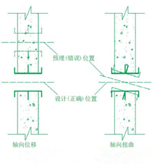 安裝位置不準(zhǔn)確主要表現(xiàn)為軸向位移及軸向扭曲。 軸向位移的表現(xiàn)為混凝土成型后,預(yù)埋套管的 位置與設(shè)計位置不符。軸向扭曲的表現(xiàn)為混凝土成型后,預(yù)埋套管中心位置雖未發(fā)生偏移,但出現(xiàn)軸向扭曲,導(dǎo)致混凝土兩側(cè)管口不同軸。軸向位移及軸向扭曲的表現(xiàn)形式見圖2。